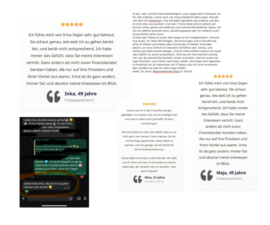 Hallo, ich bin deine unabhängige Honorar-Finanzanlagenberaterin nach §34h GewO und genau wie du hatte ich früher viel Geld auf Konten liegen und das nagende Gefühl, etwas zu verpassen. Mit 7 Jahren Finanzerfahrung und 2 Jahren als Unternehmerin habe ich einen strukturierten 6 Wochen-Prozess entwickelt, der vielbeschäftigten Frauen wie dir hilft, endlich vom Zögern ins Handeln zu kommen. Meine Expertise in Finanzplanung, ETF Porfoliostrategien und Kapitalanlageimmobilien und mein geprüftes Netzwerk sorgen dafür, dass du alle Optionen kennst; ohne Verkaufsdruck.